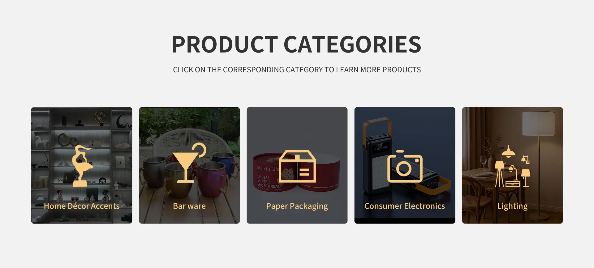 Productos principales:Objetos de decoración, iluminación de decoración, bancos de energía, accesorios de bar, caja de regalo